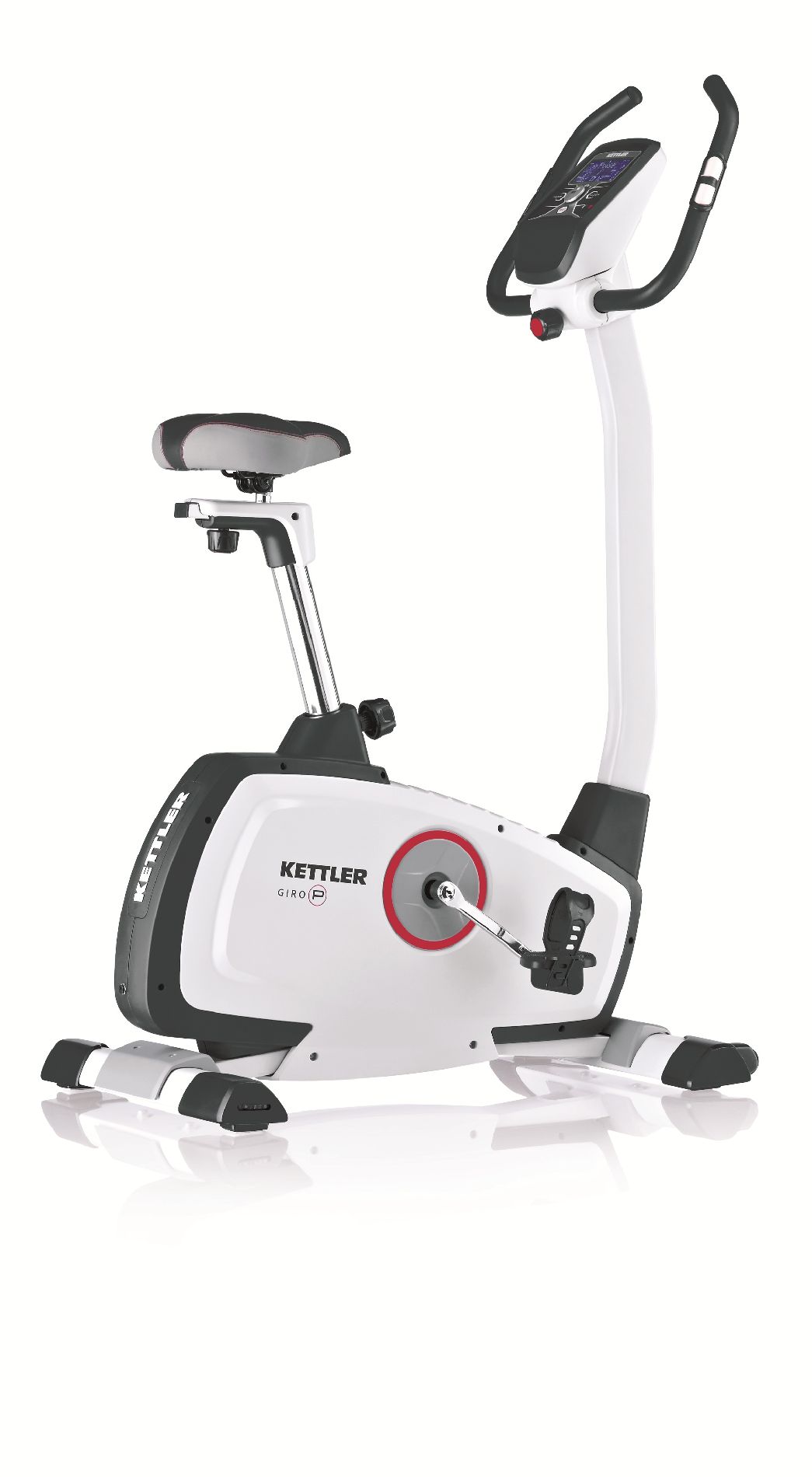 The KETTLER GIRO P upright programmable bike features a low step-thru design which makes for easier access for getting on and off while the back-lit computer provides advanced programming that is simple to operate. With the GIRO P Upright bike, you will get challenging and rewarding workouts, smooth performance, dependable componentry and workmanship, and appealing style, all at an affordable price. The KETTLER GIRO P upright programmable bike includes: Informative blue back-lit LCD electronic computer display with push & turn controls Displays: Total distance, Time, Speed, RPM, Energy consumption and Heart Rate 8 programs with adjustable intensity levels Graphic dot matrix hill profiles show preset program variations Heart Rate Control Programs automatically adjust resistance to maintain target rate Heart rate can be measured via the telemetric hand grip sensors, via the optional infrared ear clip sensor, or via the optional wireless Polar T-34 chest strap transmitter Quick Start Feature - Simply begin pedaling Recovery feature for cardio-wellness index calculation Motor-controlled variable magnetic resistance system with 16 resistance levels Handlebars covered with foam rubber for a durable and secure grip Adjustable multi-position position handle bars for a custom fit 11 inch wide, contoured, thick padded saddle for maximum comfort Saddle height is adjustable with 10 positions as well as 3 of fore and aft adjustability Weighted Self-righting pedals with foot straps Powder coated, high carbon, tubular steel frame The Q factor of the GIRO P is 9 inches providing comfort and stability Heavy 17.6 pound flywheel delivers smooth operation Sealed Ball Bearings yield smooth performance that is maintenance-free No-maintenance belt drive system Poly V drive belt yields silent operation Built-in floor levelers Transport casters make relocating simple 110 Volt power source required (Included) Maximum user weight: 285 lbs. Dimensions: 38 L x 22 W x 54 H Weight: 76 lbs.