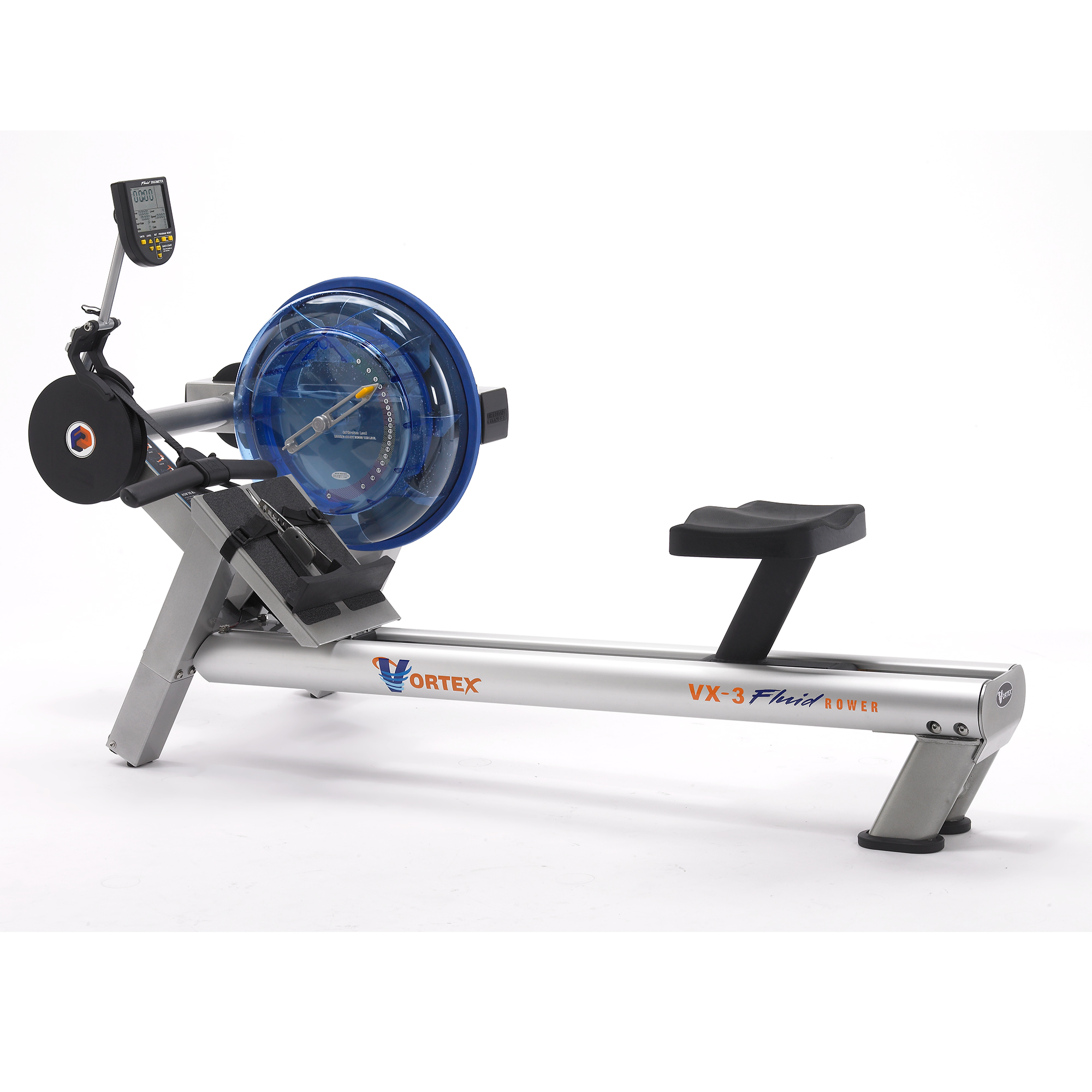 The prestigious Vortex VX3 Fluid Rower adds presence to any professional health club facility. Bring sheer delight and delivers results to your club members. Give your members a real experience with the closest rowing emulation it s like being out on the water. This stunning machine provides the sight sound and feel of river rowing. Virtually maintenance freeperfect for the highest traffic commercial environments. FEATURES AND BENEFITS:. a) Interactive Performance Monitor (IPM) with USB port: The IPM displays: time; speed; distance; stoke rate; calories per hour; watts; level pacer and has a heart rate receiver built in. The IPM gives you quick start manual programs interval training and the USB port allows interactive programming. b) Absolute comfort stability performance with 20 levels of patented variable fluid resistance. c) Compact side mounted blue polycarbonate tank with contrasting seal. d) Height adjustable footplates with advanced heel cradle footboard design (Reg. Design) and straps to ensure optimal foot placement and comfortable rowing position. e) Fitted with heart rate sensor compatible with all main HR belts. f) 6 previous workout memories and a unique pacer system. g) Unmatched durability virtually maintenance free. h) High quality metallic silver powdercoated frame with DuPont deep lacquer finish. i) Deluxe ergonomic handle allows comfortable grip and minimized strain on forearms wrists and hands. j) Low noise belt drive No chains to lubricate. k) World s most comfortable seat at "office chair height. l) Optional back seat support (Not Included). Optional back seat support may be purchased separately to add lumbar support to the rower. m) Concealed airglide seat rollers for safer and cleaner continuous smooth operation. n) Extralong anodized aluminum seat rail will suit the tallest of users. o) Rubber feet for adhesion to floor surfaces and to prevent damage. p) Rubber dipped retainer for damage free handle stowage when not in use. q) M